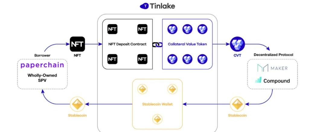 根據報道,將真實資產轉換為MakerDAO抵押品的提議,是一家名為Centrifuge的初創公司提出的。該公司基于自身開發的Centrifuge協議,創建了一個名為Tinlake的借貸平臺。在Tinlake平臺上,資產發起人可以將真實世界的資產轉化為通證代幣進行貸款融資;通過簡化融資流程降低成本,從而提高實體資產的流動性以及投資的透明度。目前,Centrifuge與Paperchain、ConsolFreight達成合作,對音樂流媒體版稅和貿易發票進行代幣化。1.流程詳解下面,我們以Paperchain為例,具體解釋一下真實音樂版稅是如何轉化為穩定幣DAI的?首先,音樂創作人在Paperchain注冊并上傳自己在各個平臺音樂集成數據;Paperchain通過自有數據模型,每24小時定價并預測其未來的流媒體收入。而后,Paperchain將該筆應收賬款打包發送至Tinlake平臺,生成具有法律效應的非同質代幣;再將NFT轉化生成帶息ERC20代幣,Paperchain可以設定該代幣的收益率以及發行數量。投資者使用穩定幣DAI購買這些帶息ERC20代幣進行投資;這些穩定幣會發送給Paperchain,并由其轉換成法幣。