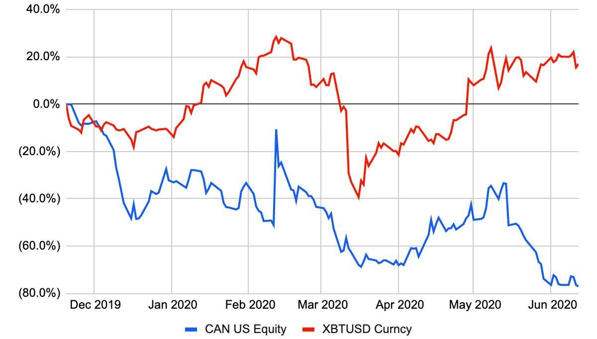 減記規模如此之大,并且就在IPO中籌集了9000萬美元之后不久發生,這一情況多少會引發市場的不信任。實際上,由于比特幣減半、價格走弱以及2017年市場泡沫中的過度投資造成的市場困難局面,我們原本預計銷售會放緩,并有適中的減記,但實際情況卻讓我們感到驚訝。投資者似乎對嘉楠的股票并不感冒,自上市以來,嘉楠股價已經下跌了77%,而同一時間比特幣上漲了17%,如下圖4所示。圖4–嘉楠股價與比特幣價格對比