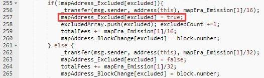 圖3通過分析修改mapAddress_Excluded值的代碼發現,在changeExcluded函數內實現了對其值的修改,且該函數修飾符為external,可供外部調用。changeExcluded函數源碼如下圖所示: