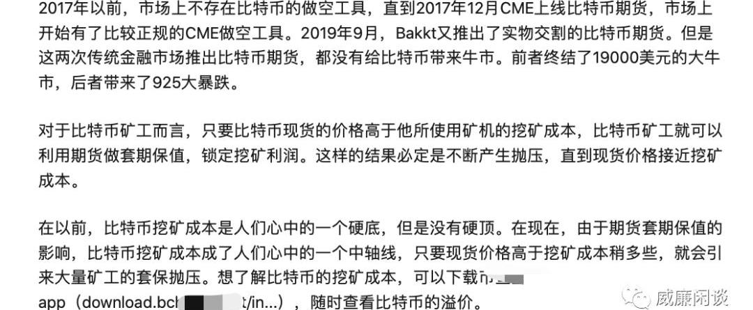 這樣的情況多了,群眾們紛紛吐槽:“做空也能賺錢了,操縱市場也能賺大錢了,波動都能賺錢了,誰還拉比特幣呢?”“比特幣短期價格絕對是被操縱的,泥哥早晚得跑路”“價格沒變,多空雙爆,狗莊玩的真特么6”最近這段時間價格沒變,暴漲暴跌,多空雙爆。幾位群友發出了他們內心最大的感慨。其實早在2014年,那時候期貨市場遠沒有現在繁榮,甚至還有所謂的“反期貨聯盟”,由當時國內的幾大交易所共同制定,因為當時的比特幣信仰者們堅決認為“能被做空”會導致比特幣不再上漲,因為不能做空的情況下,比特幣只要漲莊家才能賺錢,而能做空的情況下,比特幣哪怕跌了,莊家也能賺錢。事實上,2014年也的確是因為能做空了之后,價格一路被空軍打壓下來,直到按到了一千塊以下。2017年牛市最高點,似乎也是因為CME開通了比特幣期貨之后徹底崩壞。