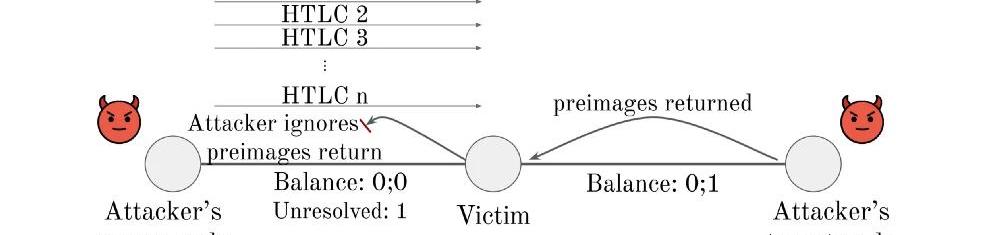 這個拓撲示例顯示了攻擊者的節點以及他與受害者共享的通道該攻擊分為四個主要階段:一、建立通道