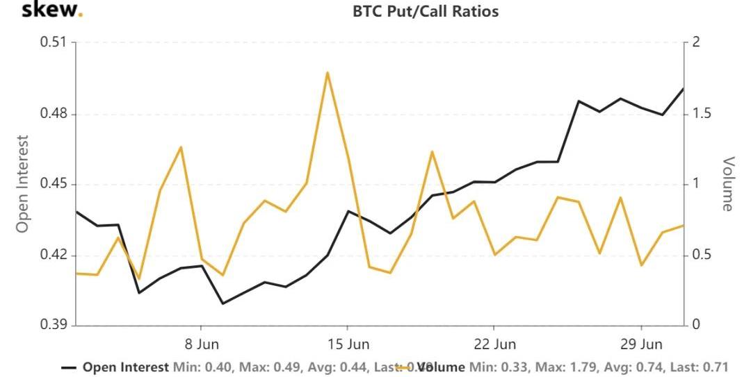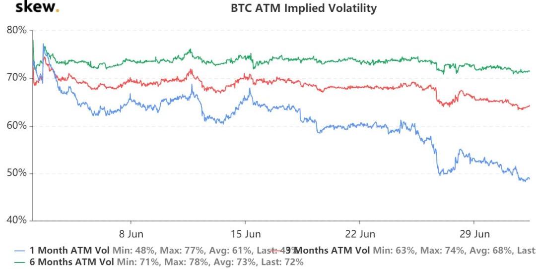 持倉量7.84億美元,正在逐步增加。交易量平靜,昨日deribit的期權交易量占到市場總交易量的93%。各標準化期限隱含波動率:今日:1m49%,3m64%,6m72%7/1:1m51%,3m65%,6m72%隱波平穩,中短期IV均已跌破今年低點。
