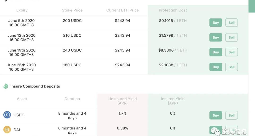DeFi的保險服務不同于NexusMutual的保險服務,NexusMutual是基于以太坊的互助保險平臺,Opyn主要是通過看跌期權為用戶提供保險服務。當前主要有兩類:一類是ETH的保護性看跌期權,二是Compound存儲資金的保險。