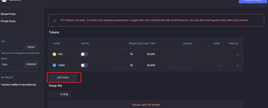 點擊“addtoken”應該是可以增加池子里面的幣種,不過網頁顯示目前這個功能還在測試,只能再等等,對Balancer的未來還是充滿期待的。