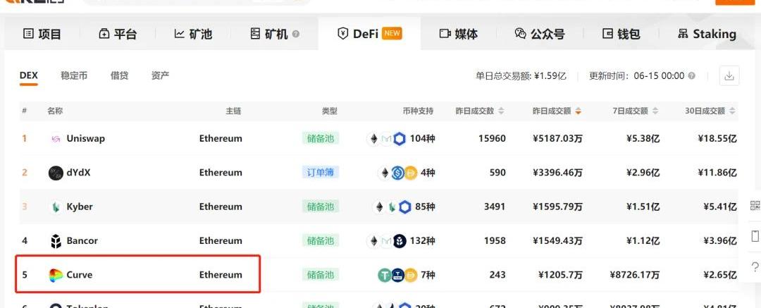 網址:https://www.curve.fi/剛開始我看到Curve我很不能理解,什么人會拿穩定幣換穩定幣?吃飽了撐的嘛?還專門為兌換穩定幣做一個Defi項目?一月份剛上線以太坊主網,寫這篇文章的時候,目前每日交易額平均都能在1000萬以上,在QKL123排行榜上排名第五,大家對穩定幣的兌換需求竟然有這么大?無比震驚!接下來和我一起探索一下這個看似雞肋卻不雞肋的項目——curve。