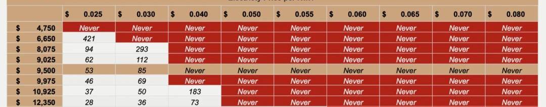 *截至2020年5月31日;**基于6.25BTC區塊獎勵,15,138,043,247,082挖礦難度,9,500BTC價格礦機能效比的改善對收益有重大影響。使用當前的比特幣難度和二手螞蟻礦機S9i的平均價格,我們可以計算出各種價格水平下的回本天數:
