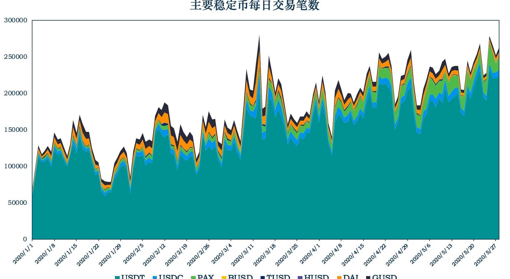 來源:MYKEY,Coinmetrics上周穩定幣總體的活躍地址數保持增長趨勢,并在5月25日創下歷史新高。24小時鏈上交易筆數
