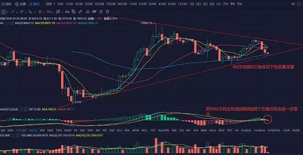 大家知道,去年價格在6400附近時,60日均線起到極大的支撐作用,而如今60日均線的支撐價格已經到7700附近,同時也可以看出目前周線處于三角區間內,一旦跌破三角區間下軌以及60日均線,那么下方的空間會快速放大。另外需要注意MACD的表現,一旦MACD回到0軸下方,意味著去年下半年的下跌行情或許會再次開啟。
