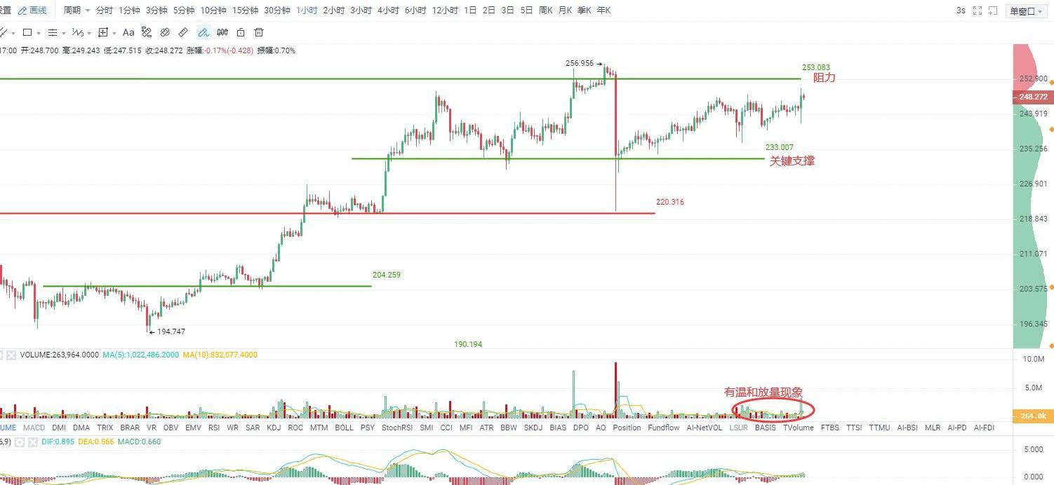 各級別性質:日線-盤整,4小時-上漲,1小時-盤整截圖來自OKEX以太坊季度1小時圖:目前的客觀走勢及應對策略:ETH由于反彈也進入了套牢盤壓力區,所以昨天的短線波動也變得劇烈,不過沒有破壞反彈局勢。從成交量來看,昨天開始成交量有溫和放大現象,尤其是剛剛的下拉回升走勢成交量放大明顯,說明多方資金主動承接力量尚可。建議后期的關注重心還是主要放在233一線關鍵支撐上,在該價位沒有跌破前看漲位主思路,但現階段的策略是有多單持倉的持有可以,但是沒有倉位的并不建議介入,因為現在距離253附近阻力較近,同時動能指標MACD又出現了較明顯的頂背離跡象,新進多單的風險收益比不合適。對于想做空單的投資者,建議重點留意幣價能否再次給出假突破的交易機會,如果有,怎大概率還是一次比較好的逢高空的機會。主觀預期:預計短期內253依然是強阻力,出現有效上破的概率不大,再次出現假突破概率偏大。但只要233支撐未破,走勢依然屬于多頭趨勢。本段不作為交易策略參考。阻力與支撐阻力:248--256--260支撐:240--233--220EOS季度合約圖