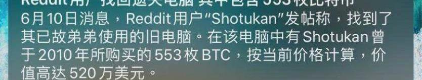 “Reddit用戶找回遺失電腦,其中包含533枚比特幣。”最近,這條消息從國外傳至國內幣圈,這533枚比特幣當前價值520萬美元,消息中還稱,那位網名Shotukan的Reddit用戶在2010年買了這些比特幣,電腦是他從已故弟弟的舊物中失而復得的。