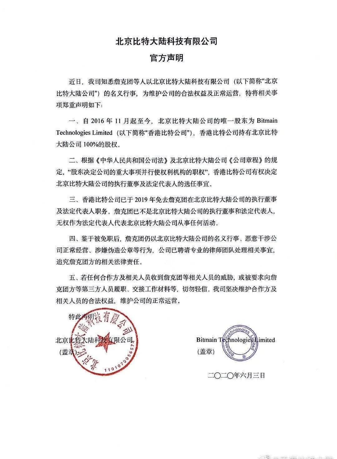 詹克團:作廢公章不能代表比特大陸,非法使用需承擔法律責任:金色財經報道,詹克團于6月20日0:09在微博發布北京比特大陸的聲明稱:“近期,有人非法使用比特大陸科技有限公司已作廢失效的原公章,假冒比特大陸名義意圖誤導社會公眾。作廢公章不能代表比特大陸,任何人非法使用作廢公章均需承擔法律責任”。同時發布的另一則日期為6月14日的聲明強調:“鑒于比特大陸的法定代表人是詹克團先生,其是唯一有權代表比特大陸的主體,公司實際經營及管理由法定代表人負責,故所有員工需要按照法定代表人的指示履行職責。”[2020/6/20]