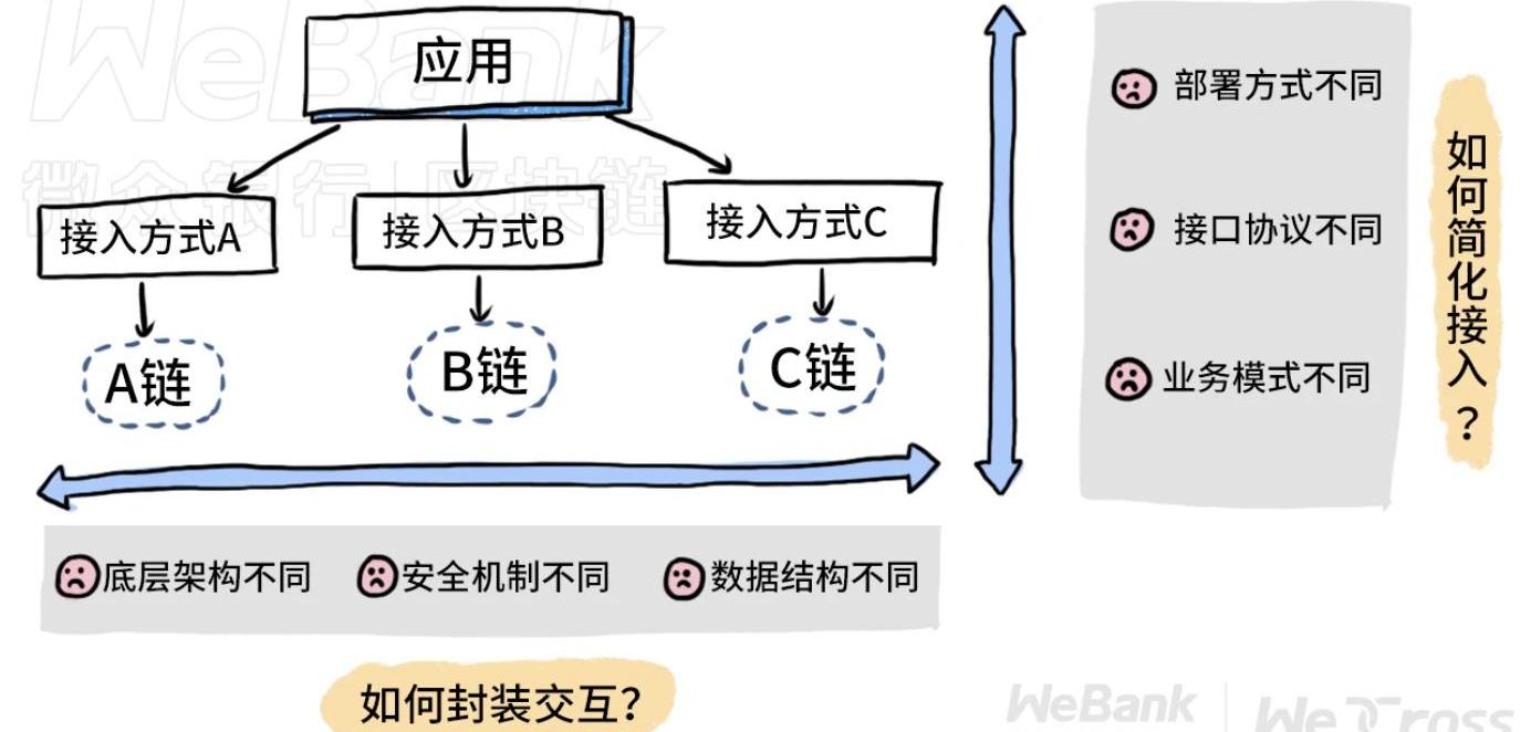 跨鏈的核心就是要降低擴展成本,要從東西和南北兩個方向提供低成本、快速便捷的解決方案。南北方向因部署方式、接口協議、業務模式等不同,需要給出簡化的接入和管理方案,東西方向因底層架構、安全機制、數據結構等不同,需要封裝安全可信的互通方案。跨鏈方案設計需融入三個理念
