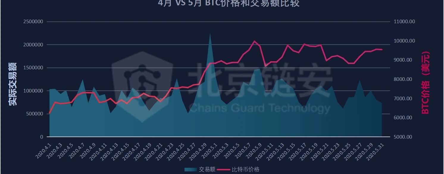 2020年5月,比特幣鏈上交易額為30471087.88BTC,相較于2020年4月,比特幣鏈上交易額為27904397.58BTC,上漲9.20%。同時,整個5月,鏈上交易額的分布也與比特幣價格波動相關,盡管仍有波動,但是相較于4月,整體分布較為平均。