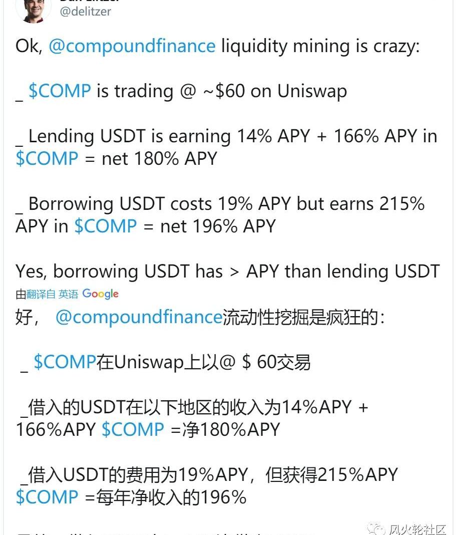 借出1000U,是有利息的,把這個利息換算到每個COMP上目前是7.7刀,也就是如果你借出只是為了擼幣,當comp的市價小于7.7刀時,你這筆買賣就不劃算了。不過對此,也有聰明人給出了針對這種挖礦機制的超額套利玩法: