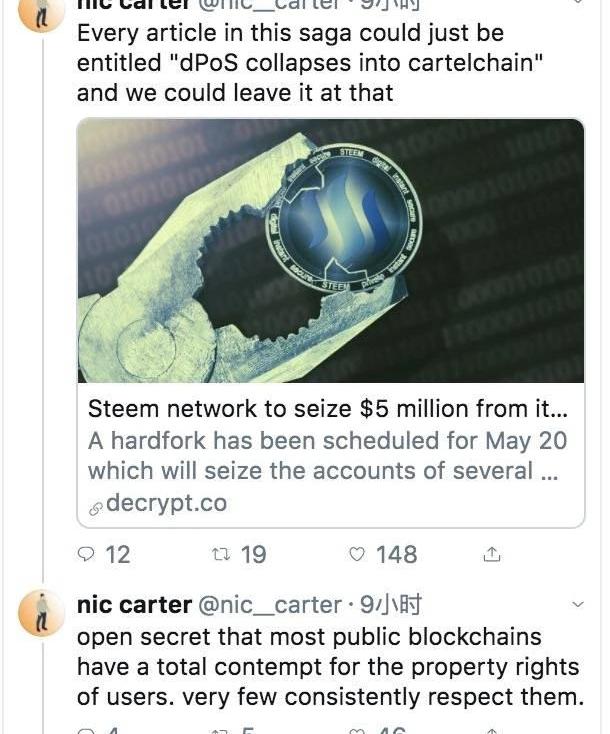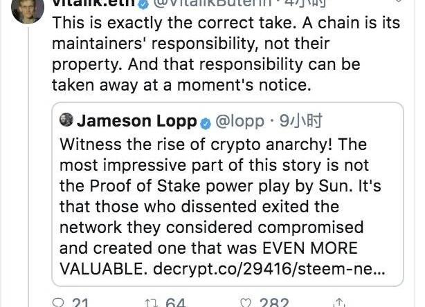 “見證了加密無政府主義的興起!這個故事中最令人印象深刻的部分,并不是孫宇晨所表現出來的權益證明的權力,而是那些持不同意見的人,退出了他們認為受到損害的網絡,并創造了一個更有價值的網絡。”對此,以太坊聯合創始人vitalikbuterin贊同了這一看法,他還回復稱:“這正是正確的看法,區塊鏈是維護者的責任,而不是屬于他們的財產。而這一責任可以在接到通知后立即解除。”當然,也有人認為這是屬于dPoS共識算法的問題,比如Coinmetrics聯合創始人niccarter則評論稱:“關于這個故事的每一篇文章,都可以被理解為dPoS區塊鏈崩潰成卡特爾鏈,我們可以就此罷休。公開的秘密是,大多數公共區塊鏈完全蔑視用戶的產權,很少有人一貫尊重他們。”