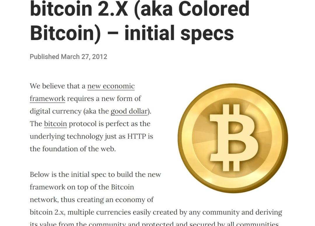 2011年6月,BTC價格觸頂后掉頭向下,直到同年11月跌至2美元左右才止住跌勢,跌幅超90%。國內加密領域從業者圈子里有句調侃的話:牛市賺錢,熊市做事。牛市的瘋狂大大提高了比特幣的知名度,讓許多人在熊市加入了這個圈子。2012年,不少與區塊鏈相關的公司相繼成立,其中就包括大名鼎鼎的Coinbase。也是在這一年,彩色幣的想法出現了。2012年3月底,一個名為YoniAssia的人在自己的網站里寫下了《bitcoin2.X(akaColoredBitcoin)–initialspecs》——初始介紹)的文章,描述了他關于ColoredBitcoin的想法。炒股的同學可能聽說過eToro這間公司,這位Yoni正是eToro的CEO。