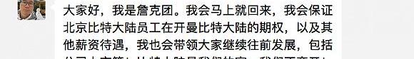 而引起吳忌寒評論的則是一張詹克團的言論截圖,截圖內容為:大家好,我是詹克團。我會馬上就回來。我會保證北京比特大陸員工在開曼比特大陸的期權,以及其他薪資待遇,我也會帶領大家繼續往前發展,包括公司上市等!比特大陸是我們的家,我們不離開!