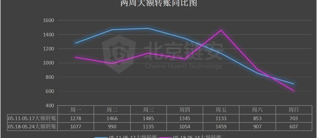 大額轉賬數:05.11-05.17:826305.18-05.24:7229較之前一周下降:12.51%詳細數據圖如下: