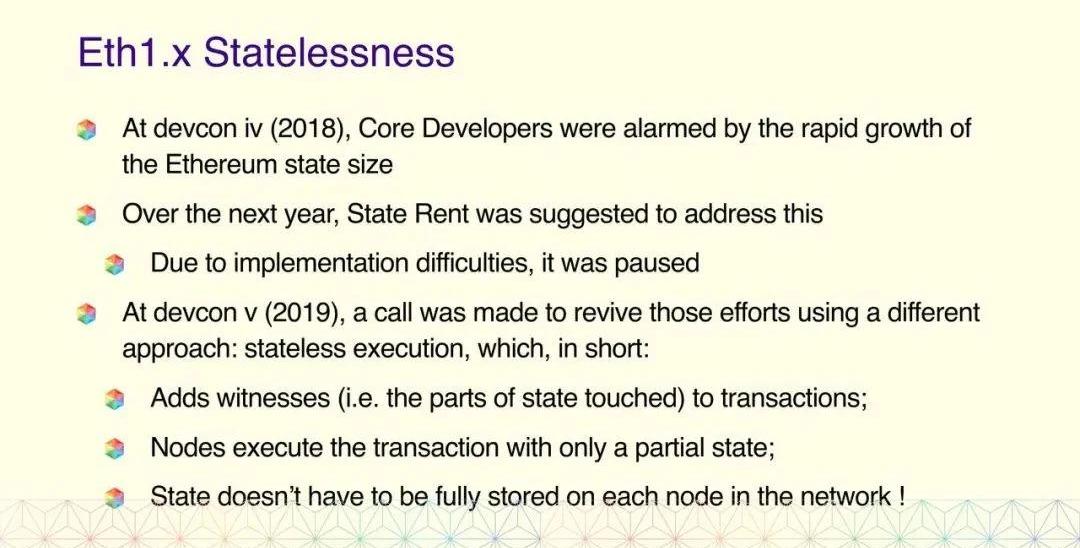 這一部分介紹了為什么要推動無狀態以太坊:解決令人頭痛的以太坊狀態數據規模暴增問題。實現無狀態以太坊后,就不需要每一個節點都存儲全部狀態了。而實現無狀態以太坊要完成四件事:壓縮區塊見證數據、形成狀態提供者網絡、交易的Gas耗用量重定價、實現狀態的靜態訪問模式。