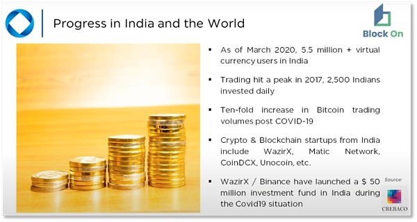 Crebaco 和 Khaitan & Co 一份報告顯示,加密貨幣尤其是比特幣和以太坊,在印度越來越受歡迎。該報告認為,印度的加密行業價值 150?億美元,從2018年1月、2020年12月開始,印度的加密貨幣流量交易所的交易量占全球總交易量的5%。