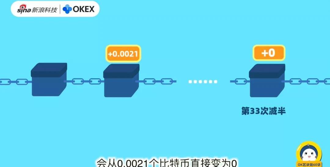 但為了保證比特幣不會短時間全部流通到市面上,中本聰又規定每產生210000個區塊,大致算起來,也就是每過4年時間,新產生的區塊所帶來的比特幣獎勵會縮減一半。也就是說,從第210001個區塊開始,每產生一個新區塊,就只有25個比特幣能流通到市面上,等到了420001個區塊,就會變為12.5個比特幣,以此類推。一直到33次減半之后,每個區塊的獎勵會從0.0021個比特幣無限趨近0。