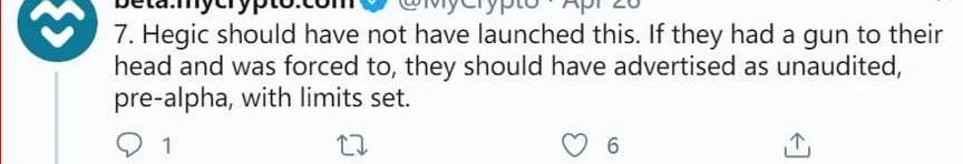 7Hegic項目目前不該推出。如果他們是被槍指著頭被迫發布產品,他們也應該宣稱自己是未經審計的、受限的Pre-alpha項目。