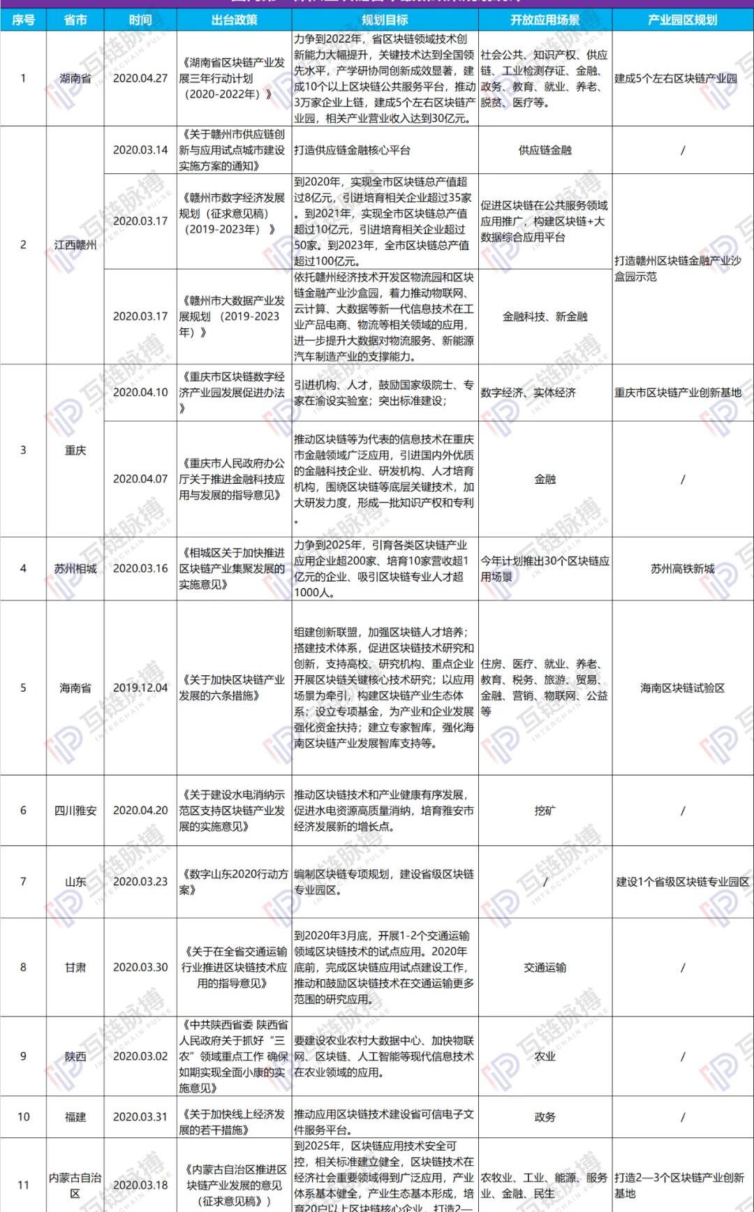 互鏈脈搏統計發現,從3月開始,包括陜西、江西贛州、山東、福建、甘肅、內蒙古自治區等在內超過10個地方政府出臺了支持區塊鏈發展的相關政策或指導意見,其中超過一半為區塊鏈專項扶持政策。并且,有四成地方政府還明確了區塊鏈產業發展的具體任務目標。比如湖南省在《湖南省區塊鏈產業發展三年行動計劃》中提出,力爭到2022年,建成10個以上區塊鏈公共服務平臺,推動3萬家企業上鏈,相關產業營業收入達到30億元。而江西贛州也在《贛州市數字經濟發展規劃》中明確,在2020—2023年期間,計劃實現全市區塊鏈總產值超過8億元、10億元和100億元,并在今明兩年內分別引進培育區塊鏈相關企業35家和50家。另外,發展區塊鏈較早的蘇州相城區也再次發布了《相城區關于加快推進區塊鏈產業集聚發展的實施意見》,指出要力爭到2025年,引育各類區塊鏈產業應用企業超200家、培育10家營收超1億元的企業、吸引區塊鏈專業人才超1000人。除了產業整體規劃外,部分地方政府還出臺了區塊鏈重點應用領域的實施方案和指導意見。比如江西省贛州市計劃重點打造供應鏈金融核心平臺,重慶市在推進區塊鏈與金融領域的應用,山西省重點發展區塊鏈等技術在農業領域的應用,福建省推動利用區塊鏈技術建設省可信電子文件服務平臺,而四川雅安市則鼓勵利用自身豐富的水電資源優勢,支持挖礦產業,培育經濟新的增長點。再建9個產業園區開放更多政府應用場景