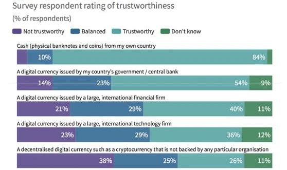 XRP/HKD-0.77%最近《經濟學人》的一項民意調查發現,只有26%的人信任去中心化的加密貨幣,人們更愿意接受央行發行的中心化數字貨幣。比特幣誕生已過十載,以它為代表的加密貨幣終于從小眾群體走進主流視野,它引發了廣泛關注,卻仍不被大多數人看好,這是為何?要采取怎樣的措施才能讓加密貨幣收獲更多主流人群的信任?一、比特幣信任度“最低”