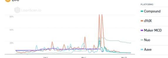 Dai歷史價格,注意從2020年3月12日開始的高波動曲線。在這段時間內,Dai的需求變大了。它變成了一種風險更大、波動更高的資產,但交易溢價很高,貸款利率達到了兩位數左右。杠桿投機者必須回購Dai才能去杠桿化,這耗盡了Dai的流動性,推高了Dai的價格,從而增加了未來的清算成本(我們將在后半部分討論導致市場流動性不足的一些更深層次的原因)。這些投機者開始意識到,在這種情況下,他們面臨1美元的債務減免可能會帶來巨大溢價的風險。最終就必須注入一種新的外部穩定資產——錨定美元的監管穩定幣USDC作為一種新的抵押品來穩定系統。