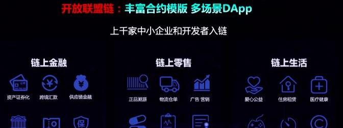 專業版和企業版均可以享受開放聯盟鏈提供的基礎服務,除了價格外二者最大的區別是專業版用戶權益的TPS≤10,每月可用燃料為10億;企業版用戶權益可使用的TPS≤100,每月可用燃料為1000億。此外前100名企業版用戶還能獲得「開放聯盟鏈」的創世產品身份。除了降低門檻,大公司們在區塊鏈這件事上也總是樂于做場景。從BaaS到「開放聯盟鏈」的演變,也是巨頭們通過降低門檻吸引更多開發者以反哺應用場景的體現。據介紹,目前開放聯盟鏈上的應用主要場景主要以2C服務類為主,涉及游戲互動、公益溯源、版權、票據民生等方面。