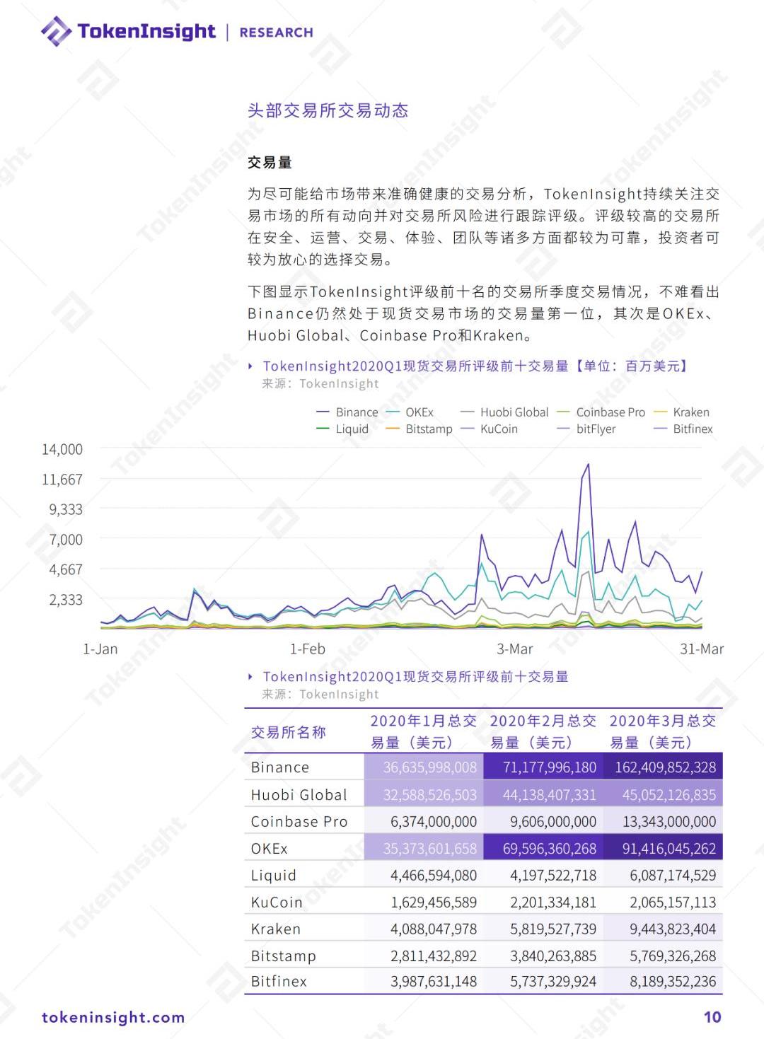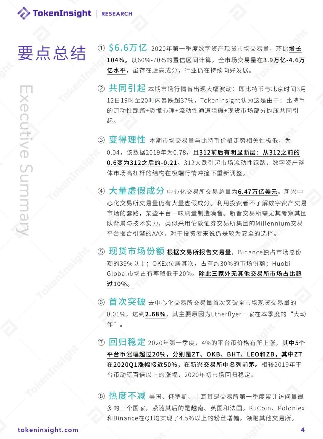 1.$6.6萬億2020年第一季度數字資產現貨市場交易量,環比增長104%。以60%-70%的置信區間計算,全市場交易量在3.9萬億-4.6萬億水平,雖存在虛高成分,行業仍在持續向好發展。2.共同引起本期市場行情曾出現大幅波動:即比特幣與北京時間3月12日19時至20時內暴跌超37%,TokenInsight認為這是由于:比特幣的流動性踩踏+恐慌心理+流動性通道阻礙+現貨市場部分拋壓共同引起。3.變得理性本期市場交易量與比特幣價格走勢相關性極低,為0.04,該數據2019年為0.78,且312前后有明顯斷層:從312之前的0.6變為312之后的-0.21。312大跌引起市場流動性踩踏,數字資產整體市場高杠桿的結構在極端行情沖撞下重新調整。4.大量虛假成分中心化交易所交易總量為6.47萬億美元。新興中心化交易所交易量仍有大量虛假成分。利用投資者不了解數字資產交易市場的套路,某些平臺一味刷量制造噪音。新晉交易所需尤其考察其團隊背景與技術實力,類似采用倫敦證券交易所集團的Millennium交易平臺撮合引擎的AAX,對于投資者來說仍是較為安全的選擇。5.現貨市場份額根據交易所報告交易量,Binance獨占市場總份額的39%以上;OKEx位居其次,占有約30%的市場份額;HuobiGlobal市場占有率略低于20%。除此三家外無其他交易所市場占比超過10%。6.首次突破去中心化交易所交易量首次突破全市場現貨交易量的0.01%,達到2.68%,其主要原因為Etherflyer一家在本季度的“大動作”。7.回歸穩定2020年第一季度,4%的平臺幣價格有所上漲,其中5個平臺幣漲幅超過20%,分別是ZT、OKB、BHT、LEO和ZB,其中ZT在2020Q1漲幅接近50%,在新興交易所中名列前茅。相較2019年平臺幣動輒百倍以上的漲幅,2020年初市場回歸穩定。8.熱度不減美國、俄羅斯、土耳其是交易所第一季度累計訪問量最多的三個國家,緊隨其后的是越南、英國和法國。KuCoin、Poloniex和Binance在Q1均實現了4.5%以上的粉絲增幅,領跑其他交易所。
