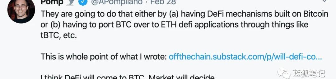 盡管Pomp并不是看漲以太坊的知名人士,但他確實強調了關于DeFi未來的有意思的觀點:要么DeFi構建在比特幣上;要么通過tBTC之類的東西將比特幣轉移至以太坊上。DeFi不會構建在比特幣上