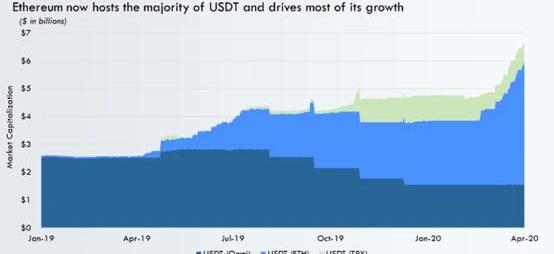 在全球安全資產大轉移和對美元大幅需求的推動下,穩定幣在2020年第一季度實現了爆發式增長,本季度其總市值超過80億美元。事實上,市場對穩定幣的需求非常強勁,以至于2020年第一季度流入該行業的價值比2019年全年都要多。大部分資金流向了Tether,且像USDC這樣的其他穩定幣市場規模也開始大幅增長。