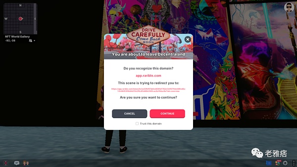Decentraland的其他地方也有商店,但只是廣義上的店鋪。幾個畫廊展示了NFT的藝術品,比如一個來自蘇富比的展覽,用戶可以走到一件作品前并點擊它,卻不能在Decentraland本身購買它。相反,你會被重定向到另一個標簽中的外部網站,該網站可以實際處理交易,通常是像OpenSea或Rarible這樣預先存在的NFT的店面。在這一點上,很容易分心去探索網站本身。