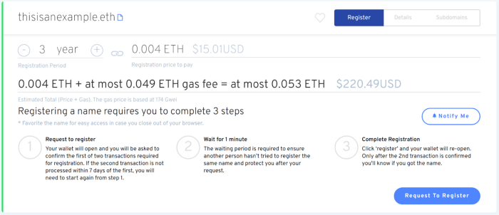 搜索你想注冊的域名。ENS 域名的價格因長度而異——域名越短,價格越高。如果它是可用的,你將能夠注冊多年。每次注冊和續費都要花錢,所以它最符合成本效益的是至少要注冊幾年。點擊 "申請注冊",等待一分鐘,然后完成注冊以確保你的 ENS 域名。