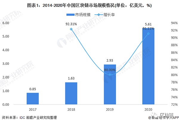 2016-2018年,大型IT互聯網企業紛紛布局區塊鏈,初創企業進入井噴模式,產業規模不斷擴大,根據IDC的數據,中國區塊鏈行業經歷了從2017年的0.85億美元級別市場規模,到2020年的5.61億美元級別產業規模的改變。在企業數量方面,2020H1我國提供區塊鏈專業技術支持、產品、解決方案等服務,且有投入或產出的新增區塊鏈企業數量達303家,同比增長274.07%。