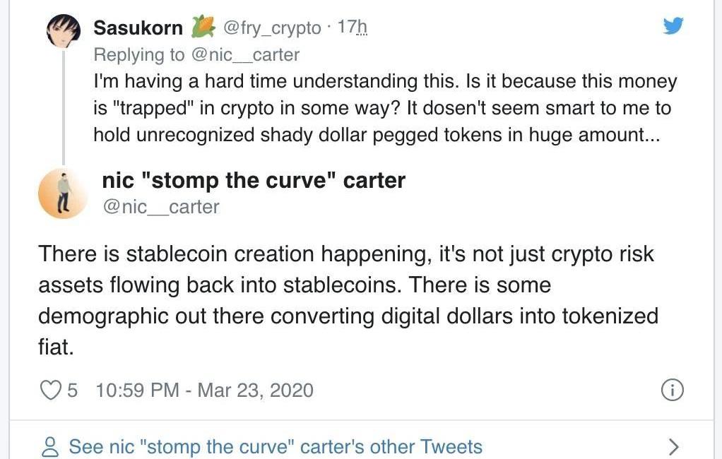 “可能與brrr有關,USDC的增長似乎與他們推出Circle平臺服務相關,USDT的需求增長則與加密貨幣交易者對風險的回避相關?特別是對于長尾山寨幣交易?”隨著最近幾周美國股市及加密市場經歷了拋售,投資者轉向了風險較小的資產,也許某些投資者會逃向錨定美元的穩定幣資產,因為在流動性緊縮期間,它們和現金是最接近的。然而,Carter認為,這并不是唯一可能的原因,他在Twitter上表示: