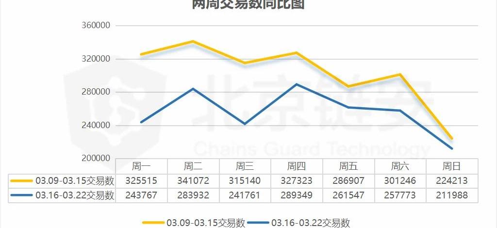 交易數:03.09-03.15:212141603.16-03.22:1790117較之前一周下降:15.62%詳細數據圖如下: