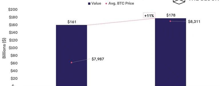 不過,比特幣鏈上交易價值比上一季度僅上升11%,從1610億美元增長至1780億美元,日均19.8億美元。