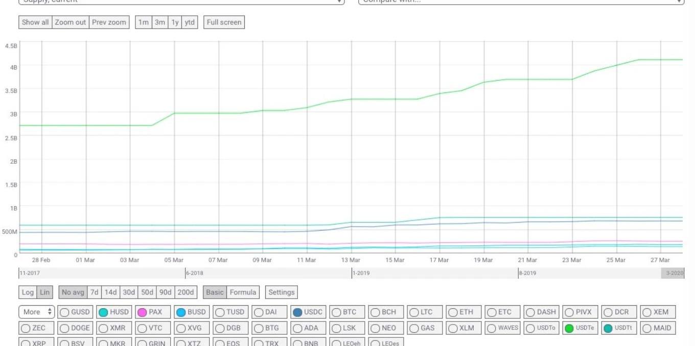 Tokenview最新數據顯示,3月25日到3月30日,六天時間,Tether共計發行了4筆USDT,每筆1.2億美金,共計4.8億美金。一改此前每次發行最多6千萬美金的慣例。近一個月時間,Tether更是新增發行了7億美金。行情網站Coingecko數據顯示,目前USDT市值超過42億美金。短短一個月時間,總市值增加22%,Tether印鈔速度比肩美聯儲。事實上,市值快速增加的不僅僅是USDT,還包括其它穩定幣。目前,包括USDT、USDC、PAX、TUSD、DAI、GUSD、BUSD在內的7種數字貨幣,總市值從2019年底的50億美金,飆升至目前的70億美金,增長幅度達到40%。其中,市值的大部分來自USDT。