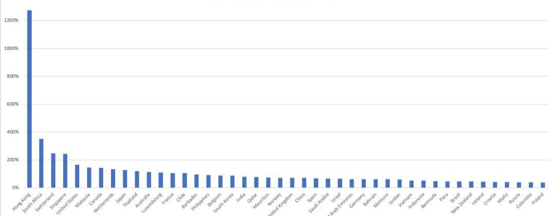 由國內上市公司市值加權的統計地圖,2018年數據來自世界銀行請注意,此地圖上沒有香港,因為不幸的是我用來構建國家/地區形狀的開源矢量文件沒有包含它。在此地圖上,香港大約占中國的50%。對比公開股票統計地圖與GDP統計地圖,你會立即注意到以下幾點:盡管美國在全球GDP中已經占了很大比重,但在國內上市股票方面占得更多南美和非洲的資本市場不發達,甚至相對于GDP來說也是如此中國的股票市場很重要,但相對于其在全球GDP中所占的份額小了小眾/避稅司法管轄區,如香港、盧森堡、新加坡、瑞士,比重都很大歐洲占股票市場的很大一部分,但低于其在全球GDP中所占份額的預期讓我們深入研究數據,發現那些從股票市場角度來看超出其權重的國家的最大離群值。