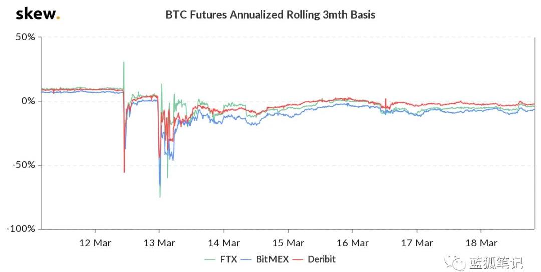 因此,3月13日,比特幣期貨的年化三個月滾動基點,其計算了期貨和現貨計價的現貨之間的價格差,在加密衍生品交易所FTX上下跌了-75%,羅瑟姆形容它為“狂野”。