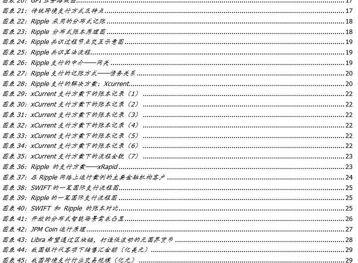 XRP/HKD-1.93%編者按:本文來自吉時通信,Odaily星球日報經授權轉載。摘要以Ripple為代表的分布式賬本技術給國際支付帶來新的靈活性和啟示。不同于傳統支付系統多中介參與的模式,分布式賬本技術(DLT,distributedledgertechnology)擁有去中心化、節點互信、數據可追溯等特點,其為國際支付帶來諸多的靈活性。世界經濟論壇將之總結為以下六點:簡化操作中的重復代理、提高監管和披露的效率、改變信任降低對手風險、縮短清算及結算的時間、資金流動快,透明度提升、歷史可追溯,提高安全性。中心化模式下的傳統電匯等跨境支付處理速度慢,中間結算成本高,支付效率低,同時還存在一定的支付風險。在國際貿易中,電匯是較為常用的國際支付方式,背后需要一系列銀行機構、清算支付系統等中介機構提供支持。目前國際支付清算體系中,無論是金融機構的資金流轉清算,還是金融信息通信網絡,大多是典型的中心化工作模式。分布式賬本技術有望重構國際支付模式。以Ripple為代表的分布式賬本系統可以同時完成信息傳遞和資金結算兩項工作。整個支付過程由系統程序自動執行,響應速度快。系統的共識機制確保信用與安全。Ripple等分布式賬本相對于傳統的國際支付清算系統在諸多方面具有優勢,但在由于各國的監管規定不同,實際國際部署中必然面臨國際法規、政策協調的問題,Ripple網絡相當于用戶之間的聯盟,國際/市場接受度方面也需要一定的拓展過程。因此分布式賬本真正要在跨境匯款中大規模使用,還需要針對監管要求進一步優化和改進、加大市場拓展力度;同時,軟件、協議層面的潛在風險、用戶、銀行端部署等細節方面亦需要進一步打磨。我們認為,跨境貿易與跨境支付面臨新趨勢、新需求、新模式的挑戰,區塊鏈有望開辟新空間。新趨勢方面,高頻次和小額度訂單的點對點場景日益突出,隨著跨境電商迅速發展,參與跨境貿易的中小企業日益增多,新的消費需求推動個人跨境消費增長,點對點式的國際支付需求快速上升;新需求方面,用戶對更為簡便快速的實時資金轉賬需求愈發迫切,傳統以天計的資金周轉無法有效滿足跨境貿易的生產需求;新模式方面,去中心化的點對點支付將開辟新的跨境貿易、支付模式,隨著全球化進程不斷推進,國際支付清算的需求不再局限于大型企業,大量中小企業甚至個人消費者對點對點、快速支付體驗需求日甚,以區塊鏈為代表的分布式賬本推動去中心化、點對點支付模式的發展有望成為未來國際支付新模式。投資建議。我們建議關注央行數字貨幣、區塊鏈供應鏈金融和數字資產主線上的區塊鏈服務企業。1、央行數字貨幣主線:四方精創、先進數通、高偉達、長亮科技、數字認證、格爾軟件、新大陸、飛天誠信;2、區塊鏈+供應鏈金融:易見股份、廣電運通;3、數字資產條線:東港股份、金財互聯、嘉楠科技、火幣科技、前進控股。風險提示:監管政策不確定性、區塊鏈基礎設施開發不達預期。
