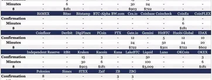 ?抽樣的交易所中93%接受ETH。?這些交易所平均所需的以太區塊確認數為18個,中位數為12個。?有兩家交易所的充值方式最為保守,分別是IndependentReserve和Liquid。這兩家交易所需要50個確認數,也就是說用戶充值到賬大約需要等待11分鐘,而黑客逆轉交易大約需要11000美元。?充值所需確認數最低的是Bitfinex,為5個確認比特幣現金下表是各交易所比特幣現金充值所需的最低確認數。