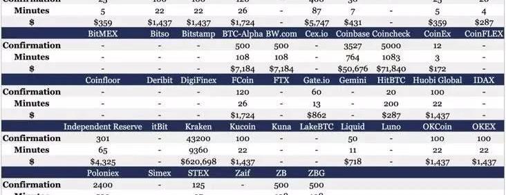 QUICKTAKE?TheBlock對46家加密貨幣交易所充值所需的區塊確認數進行了分析?主要針對九種資產:BTC、ETH、BCH、BSV、LTC、XMR、DASH、ETC以及ZEC原地址:https://www.theblockcrypto.com/genesis/59045/ltc本文系TheBlock付費內容,PANews作為其中國授權方翻譯并發布,添加小湃獲取TheBlock訂閱和發文優惠本文將分析46家交易所的9種基于工作量證明的主流加密貨幣。我們從三個維度檢測了交易所的確認時間,分別是:區塊、分鐘以及美元價值。加密貨幣交易所是黑客的主要目標,龐大的加密貨幣價值流動能夠滿足他們發起雙花攻擊并從中獲利的企圖。就在最近,有些交易所就因為比特幣黃金遭到的攻擊而受到影響。雖然交易所無法阻止51%算力攻擊,但他們可以調整充值所需的最低區塊確認數來降低這類風險。交易所上調所支持資產的區塊確認時間,能夠提高黑客逆轉交易的成本。TheBlock聯系了一些交易所,想了解他們在設置充值確認時間時對用戶便利性與安全性的權衡。但是大部分交易所“出于安全考慮”都不太愿意提供更多關于區塊確認的信息,只有一家交易所為我們提供了一些關于這類流程的見解。根據一家亞洲大型交易所的回應,為了確定某一資產的區塊確認數,大多數頂流交易所會考慮諸多因素,包括“相關代幣的算法、網絡與生態系統的歷史、當前網絡的運作情況”等等。然而,交易所也指出,平臺不得不在便利性與安全性之間權衡,他們表示:“從我們的立場看,最重要的是要確保交易所和用戶的安全。但我們同時也希望能為用戶帶去快速、便捷的體驗,所以我們正在努力實現兩者之間的平衡。”當被問及交易所多久調整一次區塊確認時間時,交易所告訴我們,技術團隊一直在監控上架資產的網絡狀態,但“沒有必要的話我們也不太愿意去調整”。下面選取九種資產的確認時間進行分析,在此之前,我們先為大家解釋下圖文中會提到的概念:?確認數:這是指在交易所充值某一資產后,該資產到賬所需的區塊確認數量。需要注意的是,有些交易所對充值/提現設置的確認數不同,本文我們只分析充值確認數。?分鐘:這是指在交易所充值某一資產后,該資產到賬所需的時間。這是通過區塊鏈平均出塊間隔時間乘以所需區塊確認數得出的。例如:比特幣平均出塊時間為10分鐘一個區塊,Coinbase上比特幣充值到賬需要3個區塊確認,因此用戶在Coinbase充值后需要等待的時間為30分鐘。?$:這是指區塊獎勵的美元價值,能夠幫助我們估算黑客試圖對交易所發起雙花攻擊時必須承擔的成本。這是通過將每個區塊獎勵的代幣乘以撰稿時代幣對應的美元價值,再乘以交易所所需的區塊確認數得出的。例如:現在比特幣一個區塊的獎勵是12.5BTC,按4986美元/BTC的價格計算,區塊獎勵大概是62300美元左右。如果一個黑客計劃對他們在Coinbase的比特幣余額發起雙花,那么成本約為187,000美元。為了簡化計算,本文我們不考慮交易費用,只考慮區塊獎勵。比特幣下表是各交易所比特幣充值所需的最低確認數。