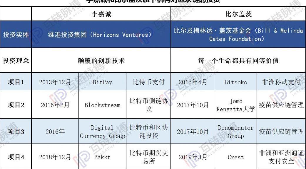 比爾蓋茨和李嘉誠,一位是原全球首富,一位是前亞洲首富,對區塊鏈的投資有著各自的邏輯。比爾蓋茨目前旗下有兩個基金,一個是拉爾森主理的信托基金——瀑布基金,負責賺錢的;另外一個慈善基金即比爾及梅琳達·蓋茨基金會,是負責花錢的。李嘉誠也有兩只私人基金,一個是李嘉誠知己周凱旋創辦的維港基金,負責賺錢;李嘉誠基金會負責花錢。但在區塊鏈的投資上,比爾蓋茨的投資主體是梅琳達·蓋茨基金會,而李嘉誠的投資主體是維港基金。投資主體的不同,也直接影響到了投資的方向。維港基金的投資理念是實現顛覆性創新的新技術,比如投資過Facebook、Skype、Spotify、siri以及生產AlphaGo的DeepMind。也因為這個理念,維港投資很早切入到了區塊鏈項目。2013年,2013年12月維港投資投資了比特幣支付公司BitPay,到了2014年5月,《南華早報》報道,李嘉誠通過維港投資繼續對BitPay投資,文章中稱,“新增投資總額并未對外公開,但是外界認為將達到過億港”。BitPay一直被稱作Bitcoin上的PayPal,面向收取Bitcoin商戶的支付解決方案,商戶收到消費者的Bitcoin,通過BitPay把錢轉成自己使用的貨幣,向BitPay支付0.99%作為手續費,是一個能賺錢的項目。此后,2016年2月,維港投資投資了Blockstream,該項目旨在擴大比特幣協議層功能的公司,主導研發側鏈的擴展機制,以連通比特幣區塊鏈與其它區塊鏈代幣。2016年維港投資了DigitalCurrencyGroup,這是一家投資區塊鏈和加密貨幣的公司。公開資料顯示,2018年最后一天的12月31日,加密交易平臺Bakkt完成1.825億美元首輪融資,投資人當中就有維港投資。整體來看,維港投資的區塊鏈圍繞著“比特幣”展開。而比爾及梅琳達·蓋茨基金會當中的資金部分來自對比特幣并不喜歡的巴菲特,比爾蓋茨本人也和巴菲特私交甚好,深得“價值投資”真傳,基金會的理念是每一個生命都具有同等價值。該基金會自然不會資助和投資“比特幣”相關的項目。據梅琳達·蓋茨基金會披露,其對區塊鏈的最早一筆投資是加納的Bitsoko項目,基金會給該項目10萬美元的捐贈。該項目是希望通過區塊鏈實現非洲地區的移動支付,降低支付成本。但是該項目官網打不開,很可能已經失敗。2017年10月,比爾及梅琳達·蓋茨基金會同時捐贈了兩個功能類似的區塊鏈項目,其一是“JomoKenyatta農業和技術大學”,另一個是DenominatorGroup,兩個項目都希望通過區塊鏈完善疫苗的供應鏈管理,但側重點有所不同。DenominatorGroup側重于疫苗質量的管理;JomoKenyatta農業和技術大學的項目記錄和監測包括衛生人員、疫苗供應商的數據。比爾及梅琳達·蓋茨基金會最近對區塊鏈的投資是今年3月對區塊鏈安全公司Crest的投資,投資目標是實現提高非洲和亞洲市場的網絡安全能力,為尚未獲得銀行服務的機構提供數字金融服務。