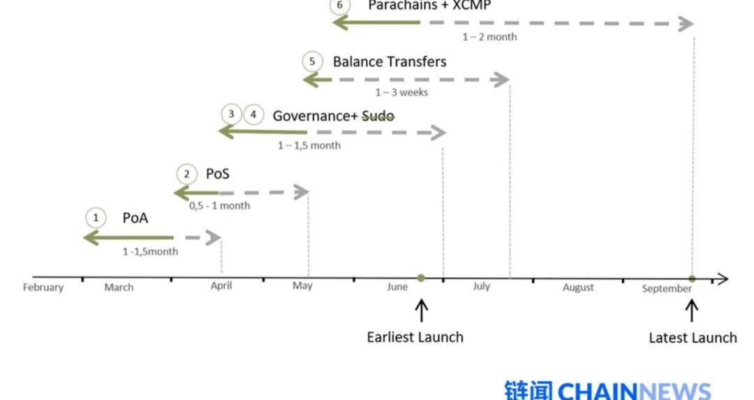 我們預計Polkadot在3月推出beta測試版本,并在2020年7月底之后全面啟動主網。自2016年11月白皮書發布以來,Polkadot區塊鏈目前處于最終測試網階段,正等待Beta版的發布,很可能這就在未來幾天發生。除測試網外,Polkadot還在測試更具實驗性的孿生網絡——「礦井中的金絲雀」Kusama。Kusama基本上和Polkadot是同一個東西,只有一點點差異,目前已處于運行模式。Kusama可以很好地指示Polkadot在準備就緒方面的進展。Polkadot以前沒有拖延既定時間計劃的紀錄,但近期有了一些非關鍵性的延誤。最初預計在2019年第三季度實現的創世區塊,后來被推遲到2019年底,之后Web3基金會又告訴我們,Polkadot將截止日期再推至2020年1月中,即中國農歷新年之前啟動。然而,最近的Kusama混亂導致其完全陷入停滯,再次將Polkadot的創世區塊事件推遲,現在估計大約在3月初。隨著問題的解決和Kusama穩定地開展工作,我們現在對期望的兌現充滿信心。據Parity稱,造成延遲的另一個原因是正在接受安全審計。2019年進行了兩次安全審計,預計在發布前將完成另外五項審計,其中,兩項已經完成,一項完成了50%,另一項正在進行中,目前正在進行一個測試。希望它們順利進行,網絡能按最新時間表啟動。Polkadot最初將作為一條權威證明區塊鏈起步,以Web3基金會為初始驗證人。然后,它將逐步過渡到一個啟用并行鏈的PoS網絡。PoS啟動之初共有100個驗證人,在啟動后的第一年將會把驗證人的封頂數穩定擴展到1000個。下面,我們概述一下由Parity提供的從Beta測試版到全功能網絡的步驟,以及我們估計完成每個步驟所需的時間:在測試階段,網絡由大約6到10個由Web3基金會運行的驗證人節點開始。在此期間,你可以申領你的DOT,并執行基本的驗證人設置命令,然后質押DOT,即可成為驗證人,或提名第三方驗證人。我們估計此階段需要一個到一個半月的時間。一旦表明已準備就緒的驗證人超過100位,將開始從PoA切換到PoS共識的升級。在此階段,僅啟動驗證人和提名者的「質押」、「認領」和「會話」模塊。這個階段需要測試PoS共識是否按預期工作:達到交易的最終性,且該網絡的一般操作不會出現漏洞錯誤。根據我們的估計,此步驟將需要兩個星期到一個月的時間。在共識運行良好這一點被確認之后,剩余的Polkadot模塊將打開,而價值轉移和并行鏈的操作不會啟用。在此階段,啟用鏈上治理后,網絡參與者可以提交進一步的升級建議并進行投票。下一步將通過一個治理提案以擺脫sudo模塊。Sudo模塊為網絡開發人員提供了壓倒一切的權限,可以在發生任何問題時發布任意的網絡升級。Sudo開始是作為一種安全措施存在,以避免重大技術錯誤引起的問題,在網絡穩定后應該退出。我們認為,第3和第步合計將花費一個半月的時間。在刪除sudo模塊的治理提案通過以后,下一個提案應該是啟用DOT持幣者之間的價值轉移。我們認為這一步驟需要一到三個星期。最終將啟用并行鏈,并進行對并行鏈的第一次插槽拍賣,但必須是在成功執行步驟1至5之后。此階段還將啟用跨鏈消息傳遞協議。我們估計完成此步驟所需的時間為一到兩個月。因此,我們估計,完整的Polkadot區塊鏈主網啟動最早可能會在創世區塊事件后3?個月。啟動的最晚日期應在創始區塊產生后的6?個月內。如果主鏈的PoA版本如我們預期的那樣在3月啟動,那么全面啟動應該在6月的最后一周到9月的最后一周之間。合理地講,主網啟動很可能在此期間推出。