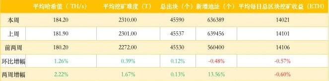 etherchain.org數據顯示,平均算力環比上漲1.26%,暫報184.2TH/s;挖礦難度環比上漲0.39%,暫報2310T;其他數據與前一周相比并無明顯變化。