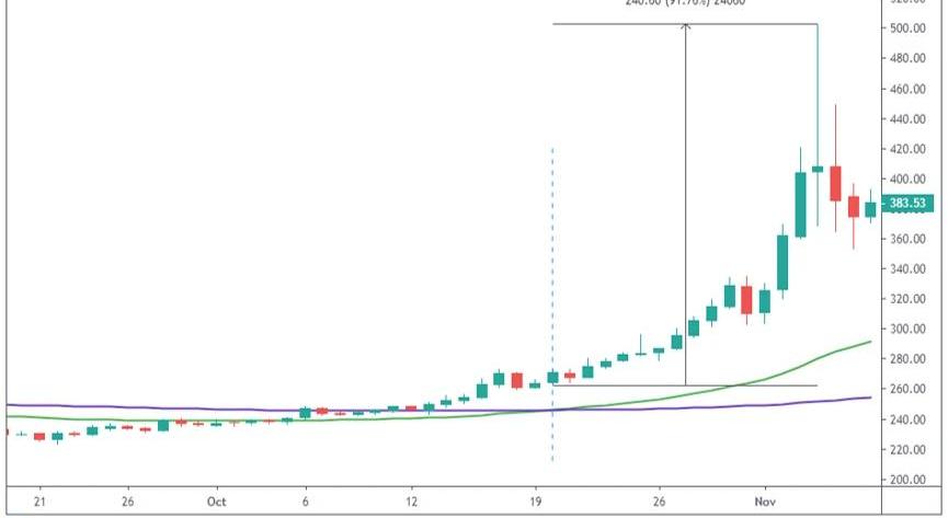 圖3:2015年7月至9月BTC價格日線圖vsMA50,200(綠/紫)-Tradingview比特幣在2015年7月至11月間,價格上下浮動巨大。在7月10日經歷了黃金交叉后,又在9月1日形成了死亡交叉,其后再次于10月20日形成黃金交叉,同時這次黃金交叉的形成伴隨著幣價的起飛,在其后的15個交易日里,幣價上漲了近90%。