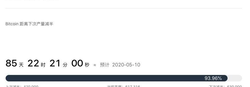 數據來源:標準共識、CoinMarketCap根據標準共識減半倒計時指數顯示,BTC目前區塊高度為617,316,距離下次減半僅剩有85天。BTC實現減半利好預期還需要一定時間,但投資者需關注BTC減半時間,下次減半已經臨近,BTC價格目前逐漸恢復到$10,000。